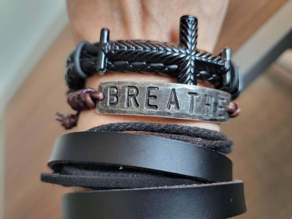 This hand-stamped leather bracelet features the word Breathe — a quiet cue to pause, steady yourself, and return to the present moment. Designed as a grounding piece, it serves as a gentle reminder during moments of stress, anxiety, or overwhelm.